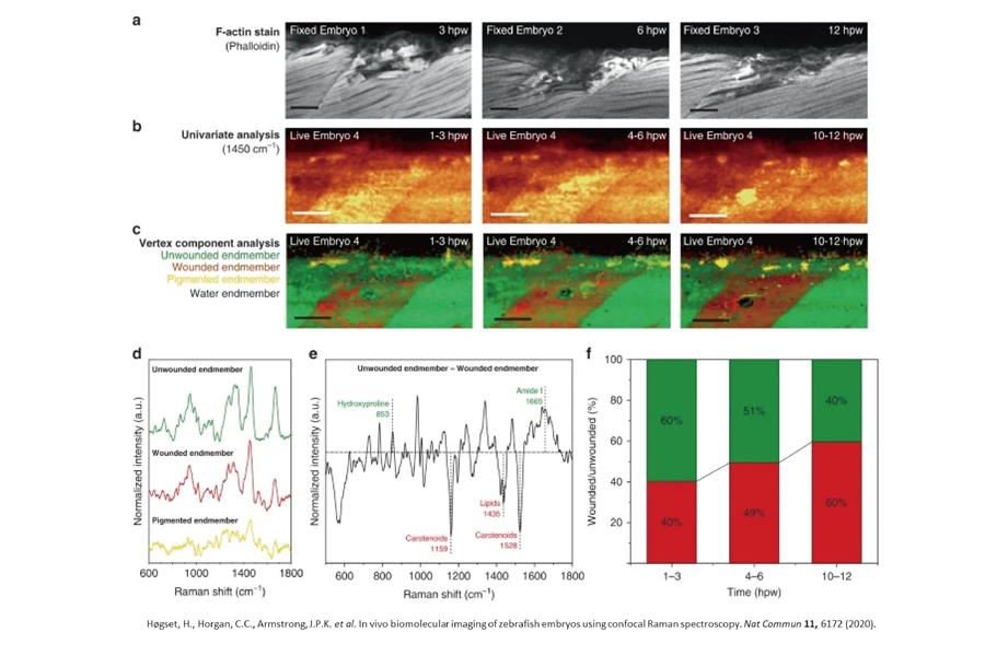 在這個文獻中,作者就利用了三維的拉曼擷取來驗證斑馬魚的胚胎上的ΔRD1基因突變造成的膜破壞。達到一個非染色且有時間變化的分子鑑別的生醫影像
